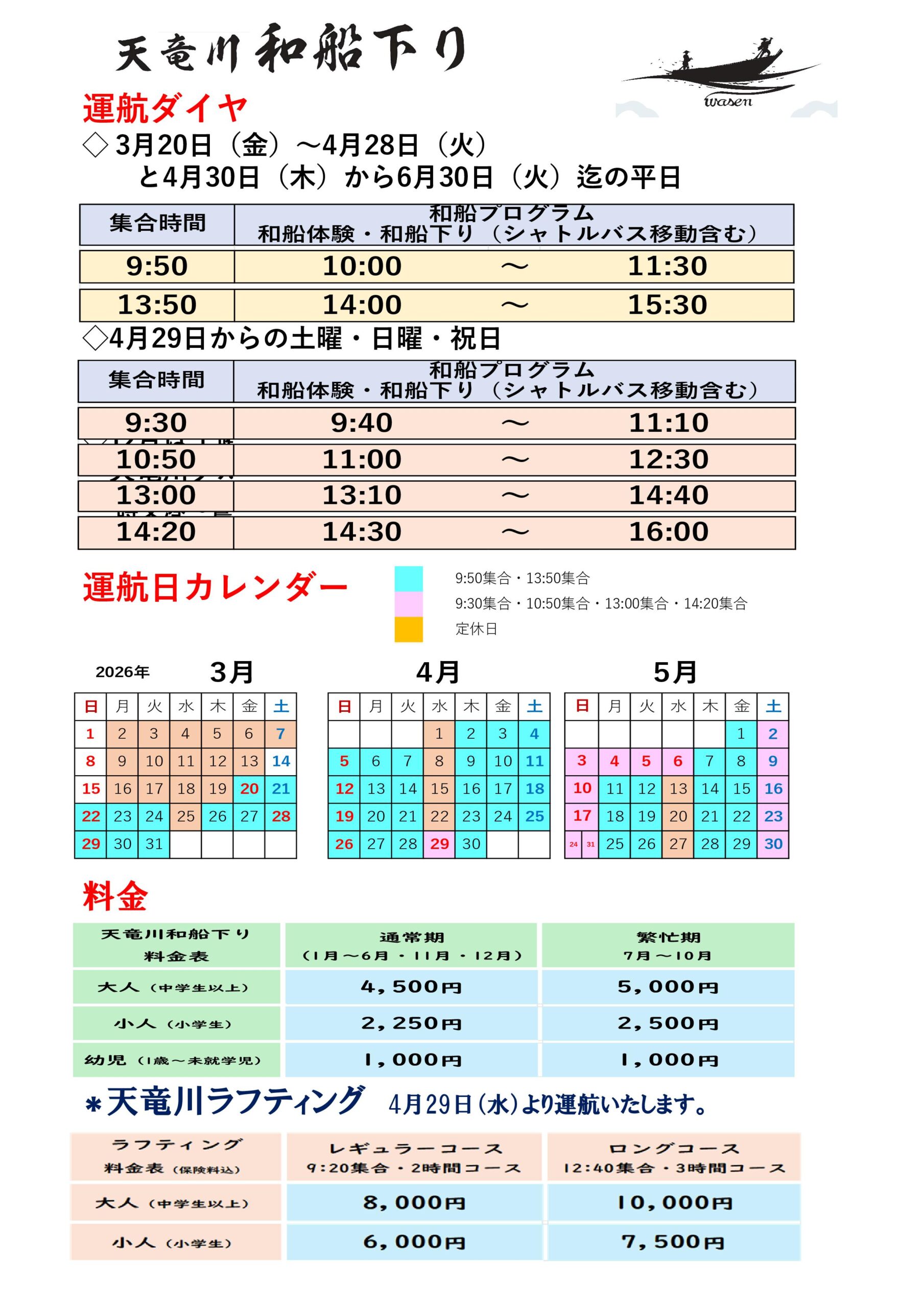 *2026年 3月20日(金)~4月28日(火)の期間は1日2便(9:50集合・13:50集合)を運航です。