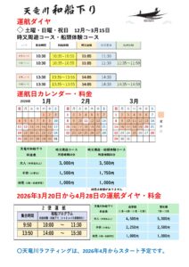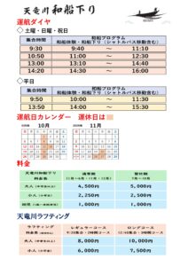 ☆天竜川和船下り 10月・11月の運航について 土曜日・日曜日・祝日 【9:30集合プログラム】・【10:50集合プログラム】・【12:50集合プログラム】・【14:10集合プログラム】の運航となります。 【9:30集合
